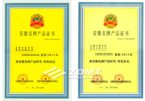2012年3月22日,馬鞍山市召開了全市質(zhì)量技術(shù)監(jiān)督工作會議,會議對2011年獲得質(zhì)監(jiān)部門相關(guān)榮譽的企業(yè)與個人進行了表彰,我公司中德牌液壓擺式剪板機和中德牌液壓板料折彎機兩個產(chǎn)品分別通過了2011年“安徽名牌”的復(fù)審。